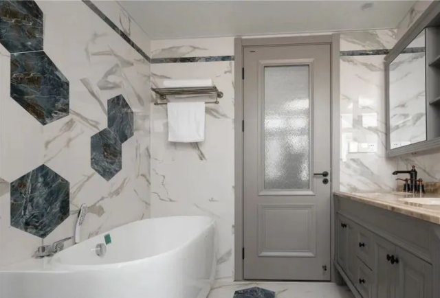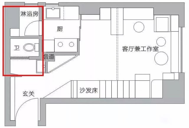 将洗手台移出卫生间,这样进门的第一眼就不再是卫生间。比如下面这个户型,卫生间和入户门挨的非常近,中间几乎没有空间可以做隔断,所以将洗手台移到外面,马桶区和淋浴区依然放在里面。