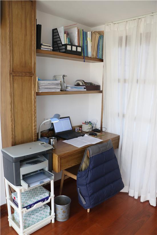小书房,原木色的成套桌椅柜子,有点乱,收拾整齐还是好看的。