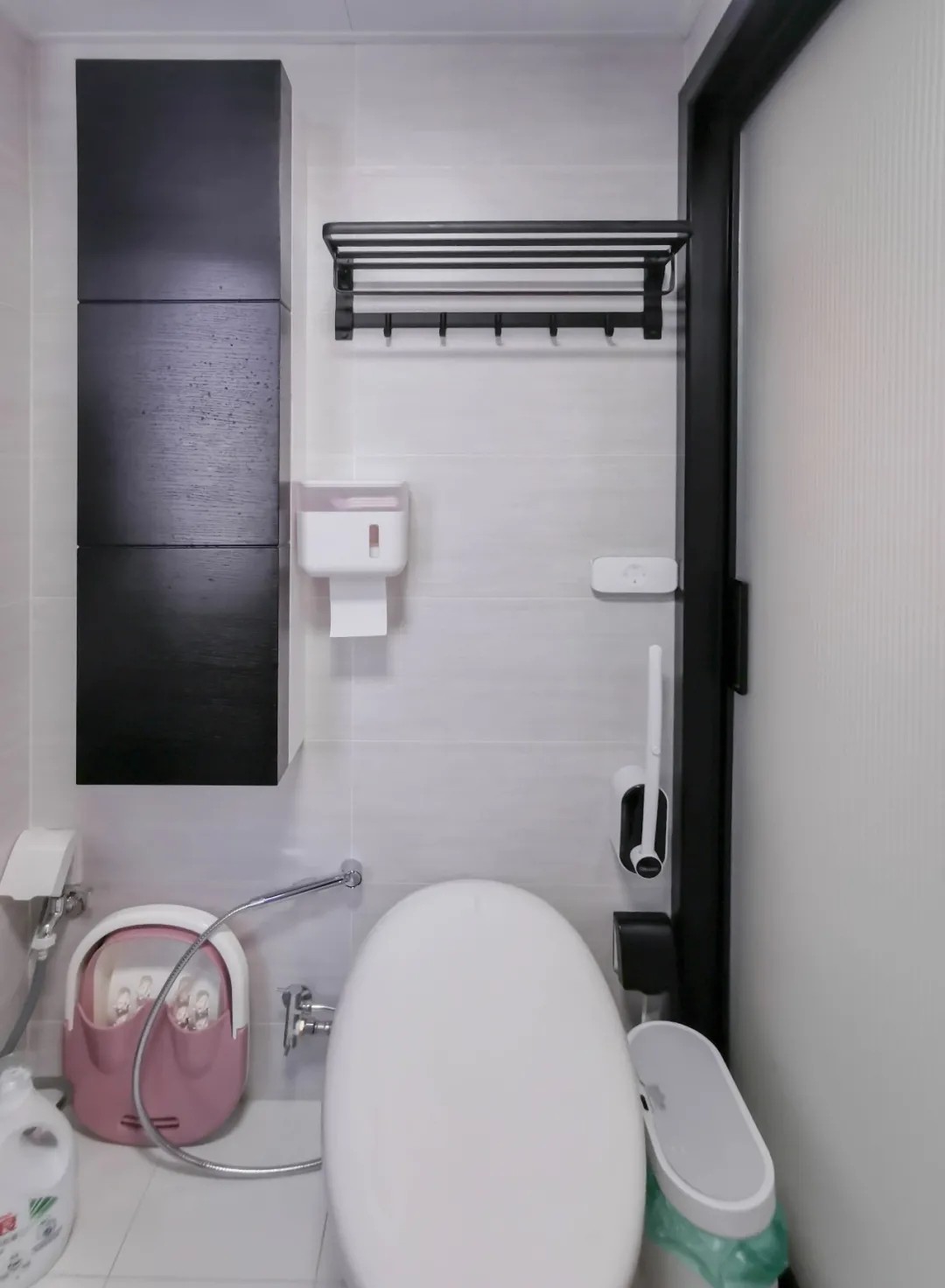 门后的空间也得好好利用,上方放置了电热毛巾架,上海雨季的时候毛巾再也不用湿漉漉还一股霉味了;下方安装了拖鞋架专门放淋浴时的拖鞋。