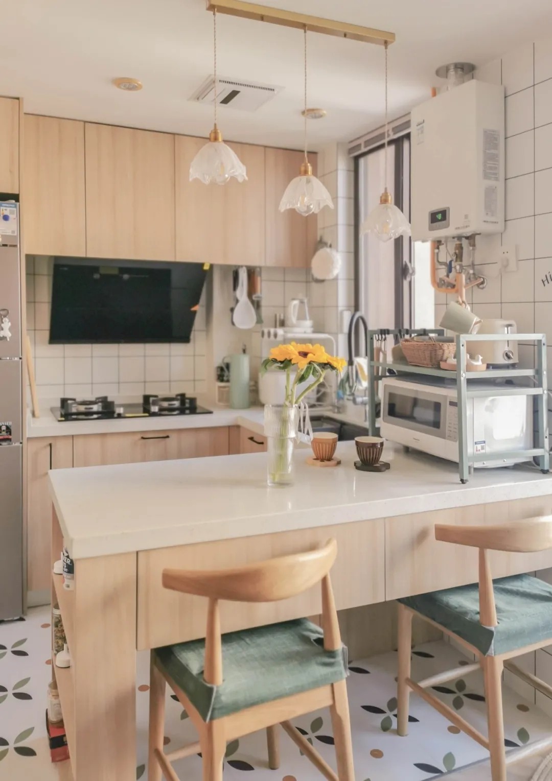 砸掉和客厅之间的隔墙以后,在原来墙面的位置做了二合一台面,任何繁杂的切洗操作,在这样的大台面上,都能游刃有余。