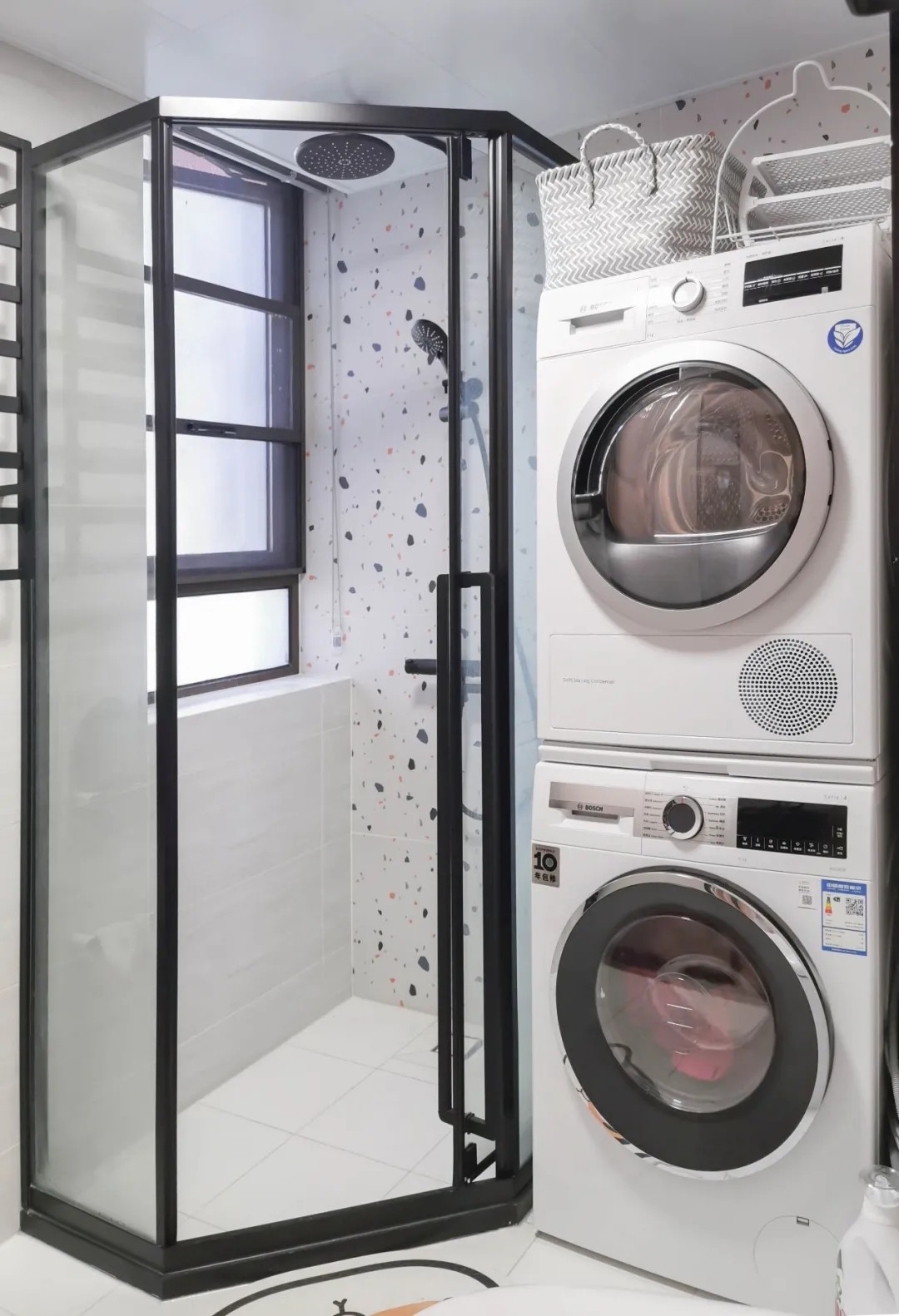 这样一来,卫生间里洗衣机和马桶都能容纳,用上钻石型淋浴房这个小卫生间神器,独立淋浴区也有了。