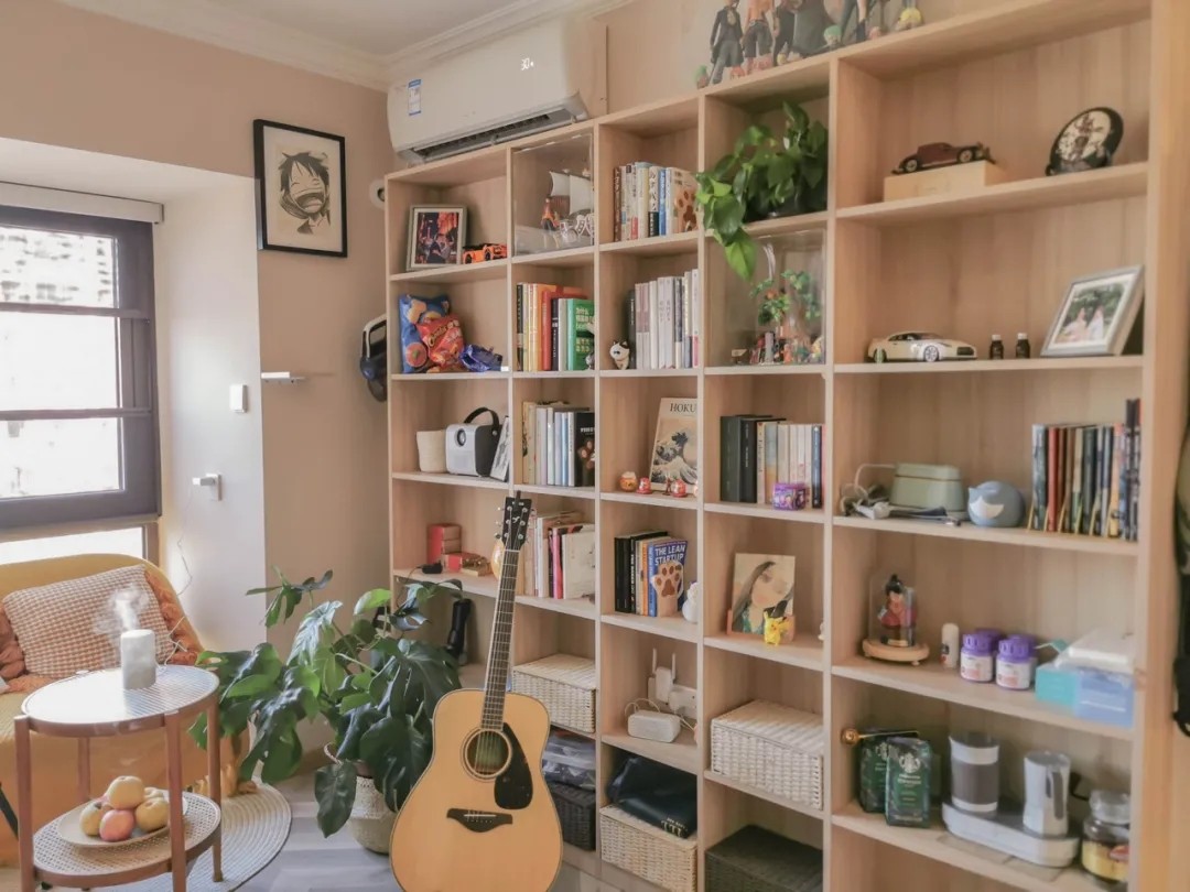 沿墙面做了开放式满墙置物柜,可以解决客厅书籍、杂物的收纳,还能陈列手办和一些装饰物。