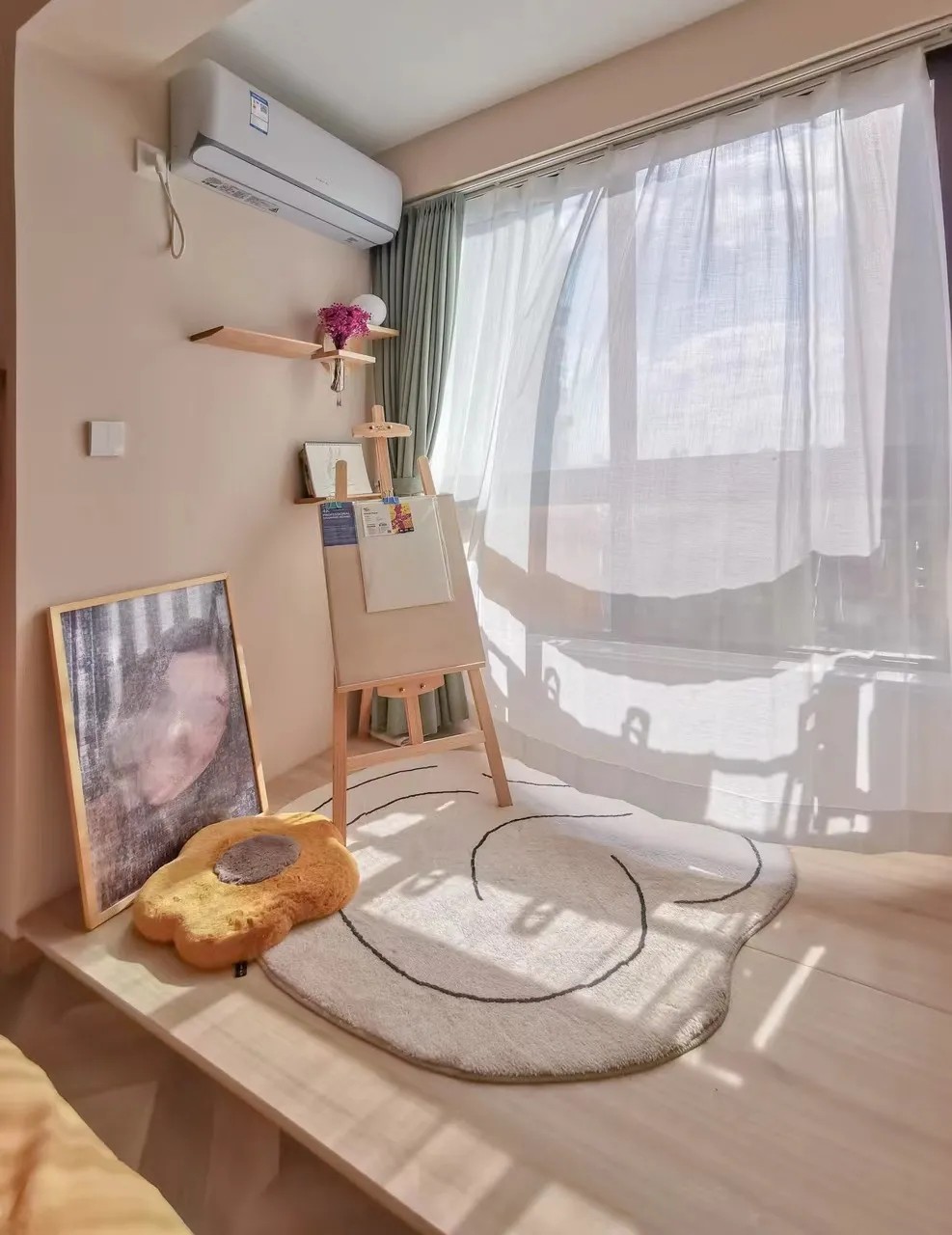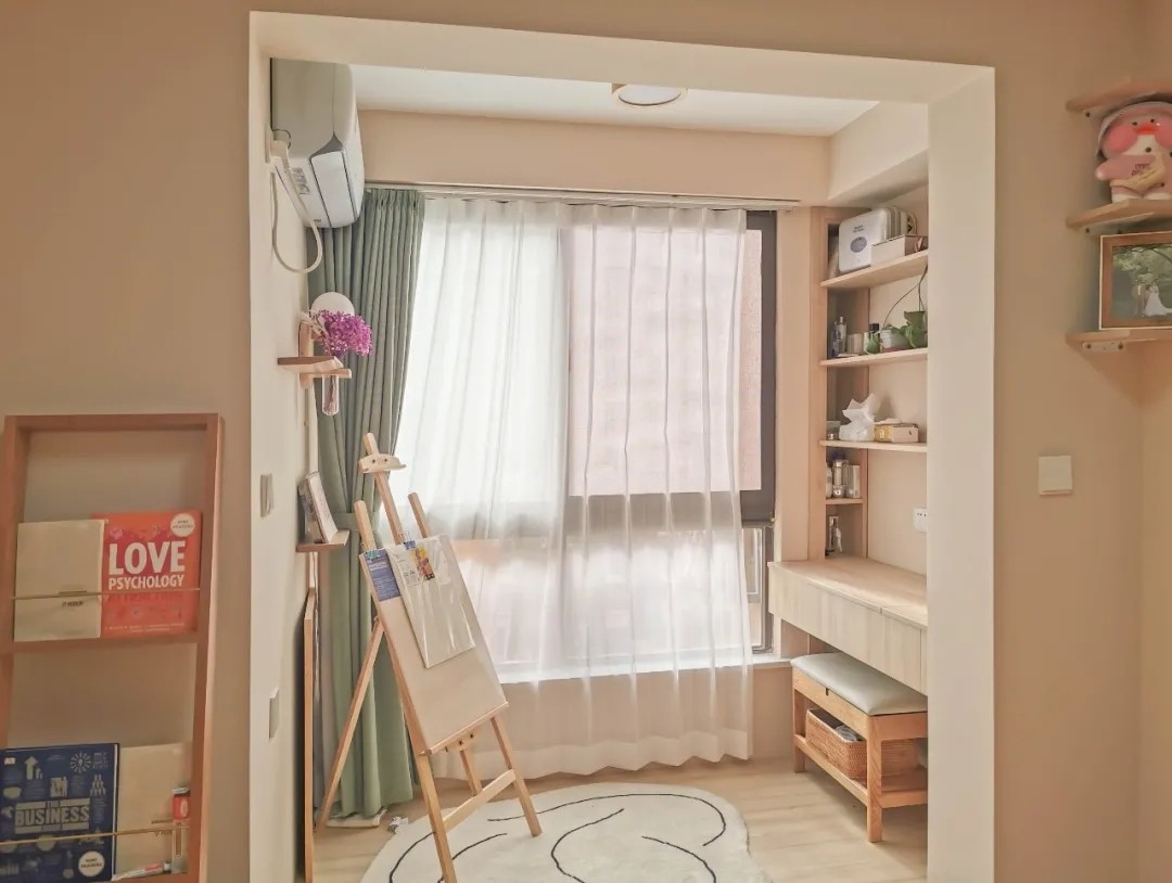 阳台面积虽小,但在这光线最好地方,一侧放置了女屋主的画板,另一侧做了可翻折的梳妆台,也算是物尽其用。