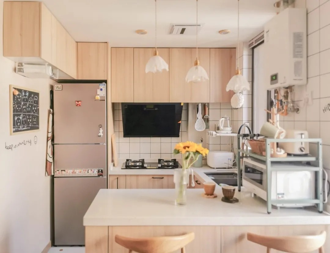 原本的厨房是典型的“L”型台面布局,放置了冰箱、灶台和水槽以后,丝毫没有任何操作空间。